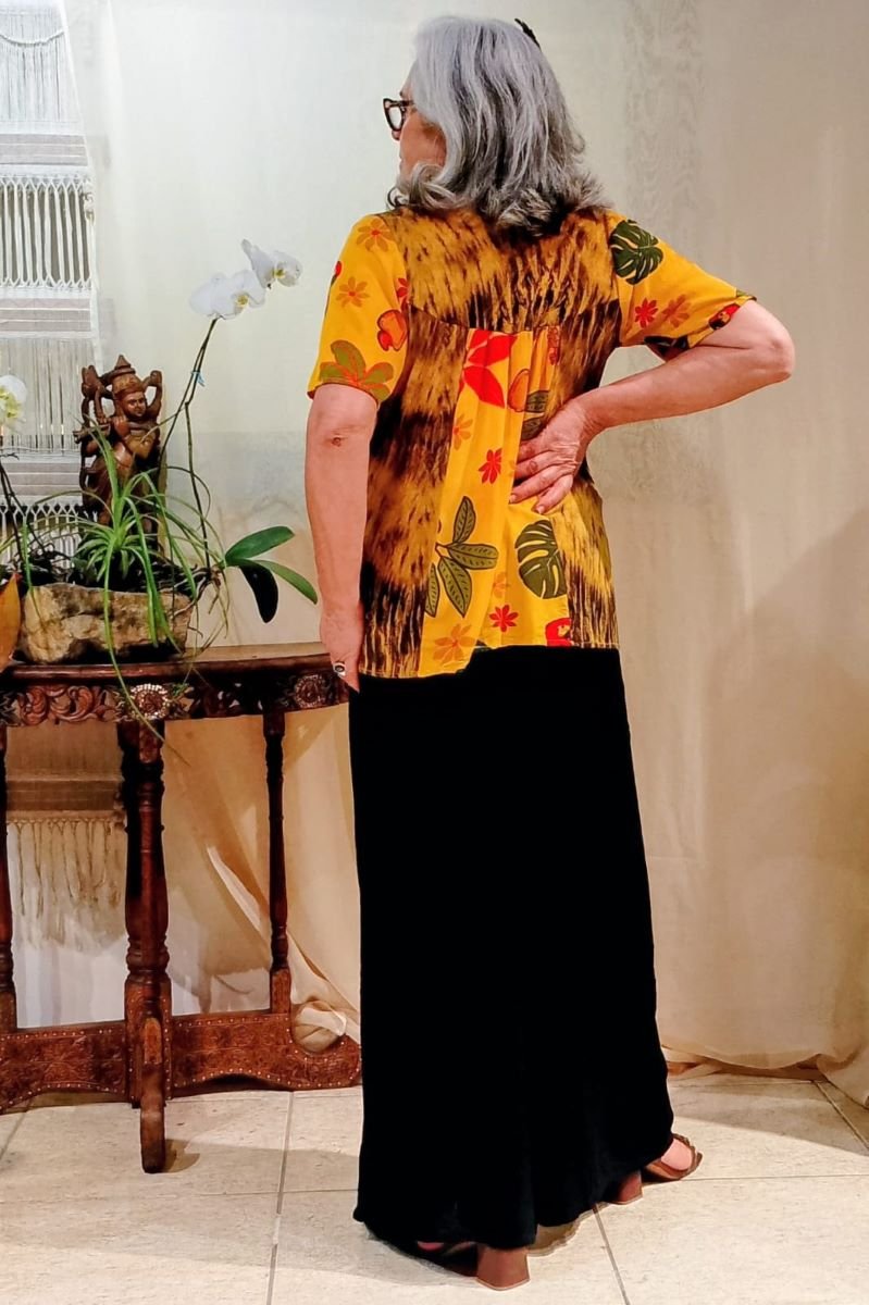 Bata em Viscose em Patchwork Ciganinha com Mangas Curtas Amarela e Tie GG