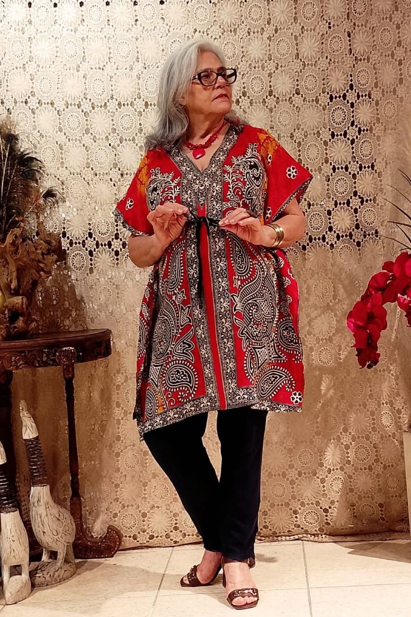 Conjunto de saruel e túnica longa, chamado punjab, com decote em V e cavado,