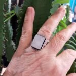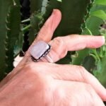 - Anel em Pedra Natural, Quartzo Rosa, conhecido como a pedra do amor, possui formato retangular e uma lapidação polida que realça sua cor suave e transparência natural.