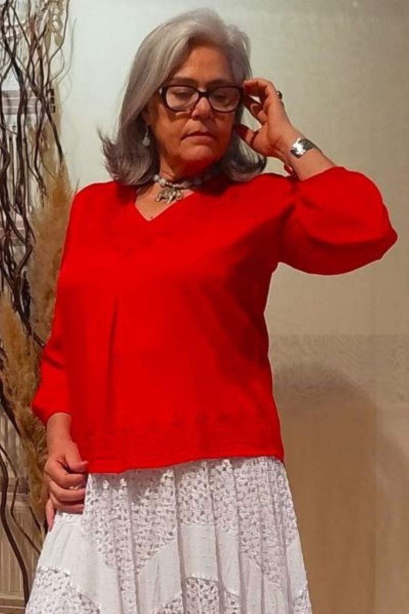 Be the first to review “Bata em Viscose com Decote em V Bordada Gola Padre e Meias Mangas Vermelha” Cancelar resposta