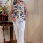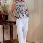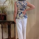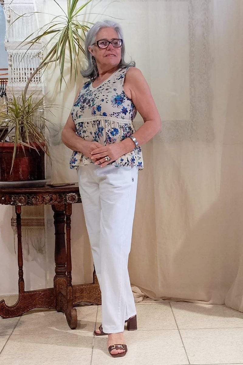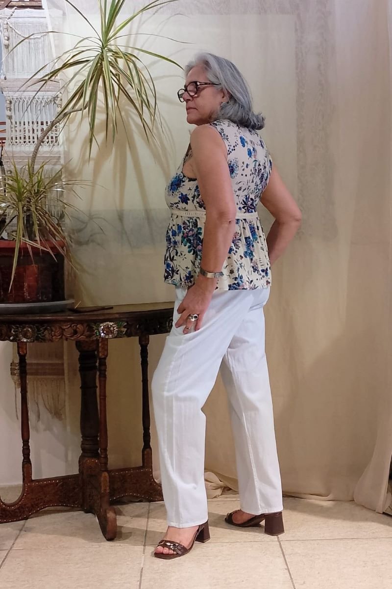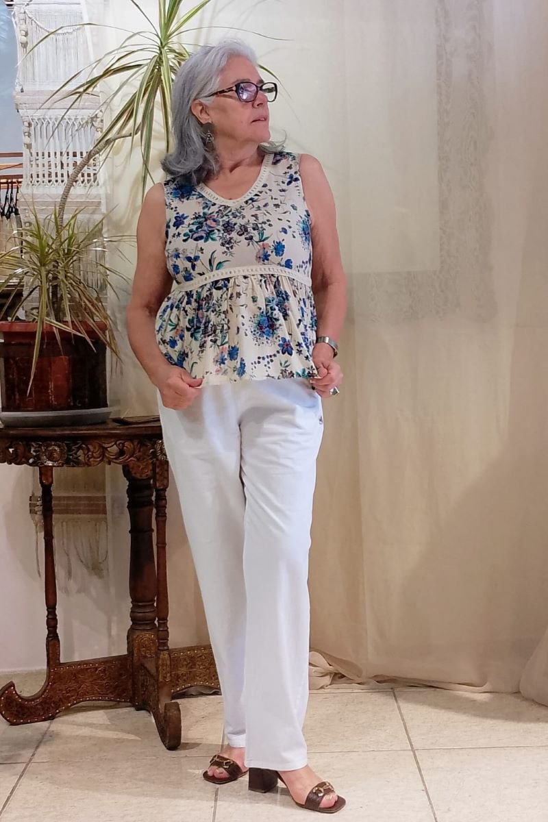- Bata regata em viscolinho com estampa floral off e azul, decote em V com detalhe de galão cru e recorte abaixo do busto com leve franzido. Caimento fluido e natural, ideal para looks leves e femininos.