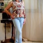 - Bata regata em viscolinho com estampa floral off e laranja, decote em V com detalhe de galão cru e recorte abaixo do busto com leve franzido. Caimento fluido e natural, ideal para looks leves e femininos.
