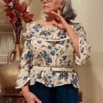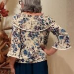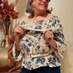 - Blusa cropped em viscolinho com decote ciganinha, com estampa floral azul