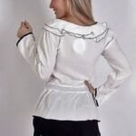 Blusa em viscose branca com jabôt duplo e acabamentos em preto, combinando elegância e conforto. O contraste marcante realça o visual e a modelagem valoriza a silhueta com toque delicado e feminino.