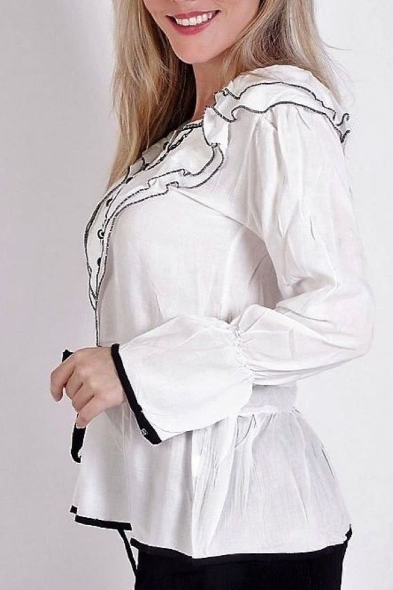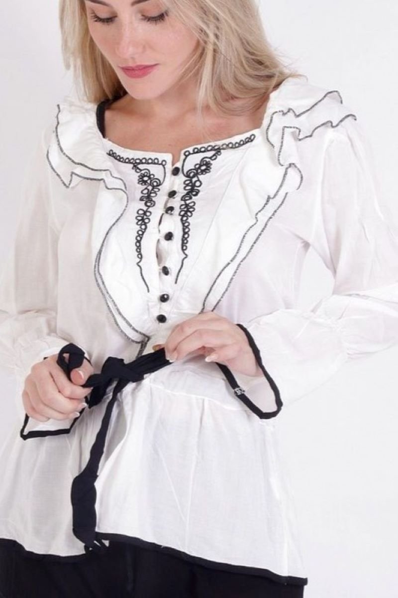 Bata em Viscose com Mangas Longas Babado Debrum Preto Branca M