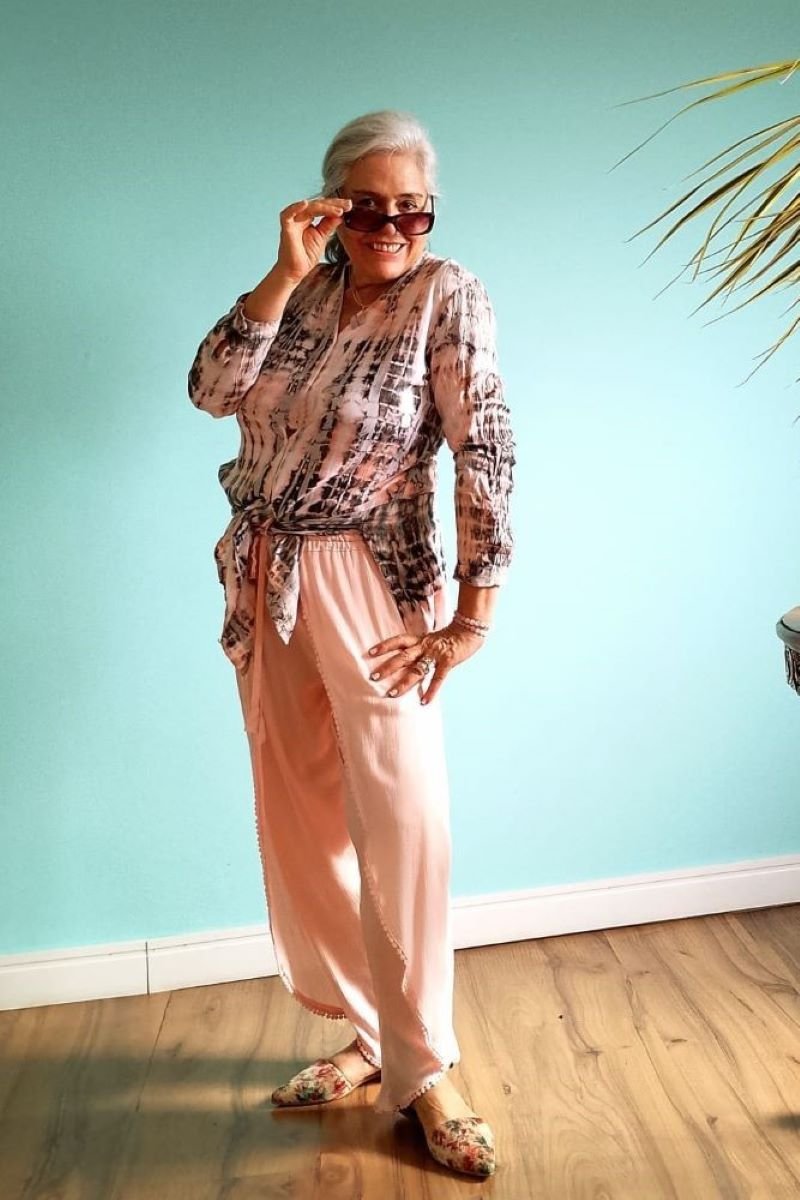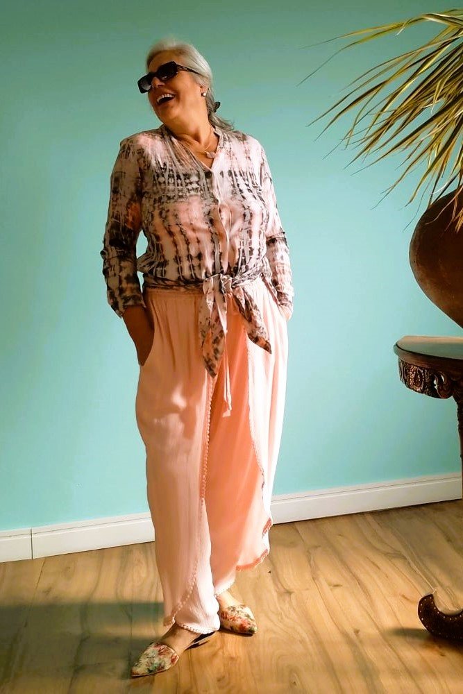 - Calça em Viscose, com envelope fake e com corte tipo cenoura, com caimento amplo e sem volume, vestindo perfeitamente bem dos manequins 42 ao 48. A tonalidade rosa pastel lhe confere um charme a mais de fluidez e delicadeza
