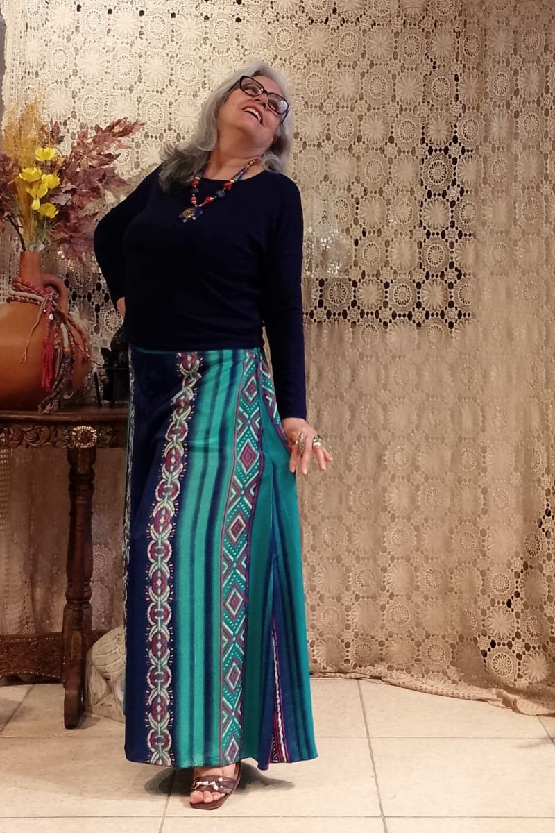 - Sinta a leveza e a sofisticação da nossa Calça Pantalona em Seda Indiana. Com uma estampa digital moderna com fundo cinza e estampa com predominância das cores azul turquesa e vermelho, esta peça une o movimento fluido das pernas amplas ao conforto da cintura alta com pala e lastex. Um design atemporal que valoriza a silhueta, ideal para quem busca elegância e bem-estar do manequim 42 ao 46.