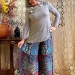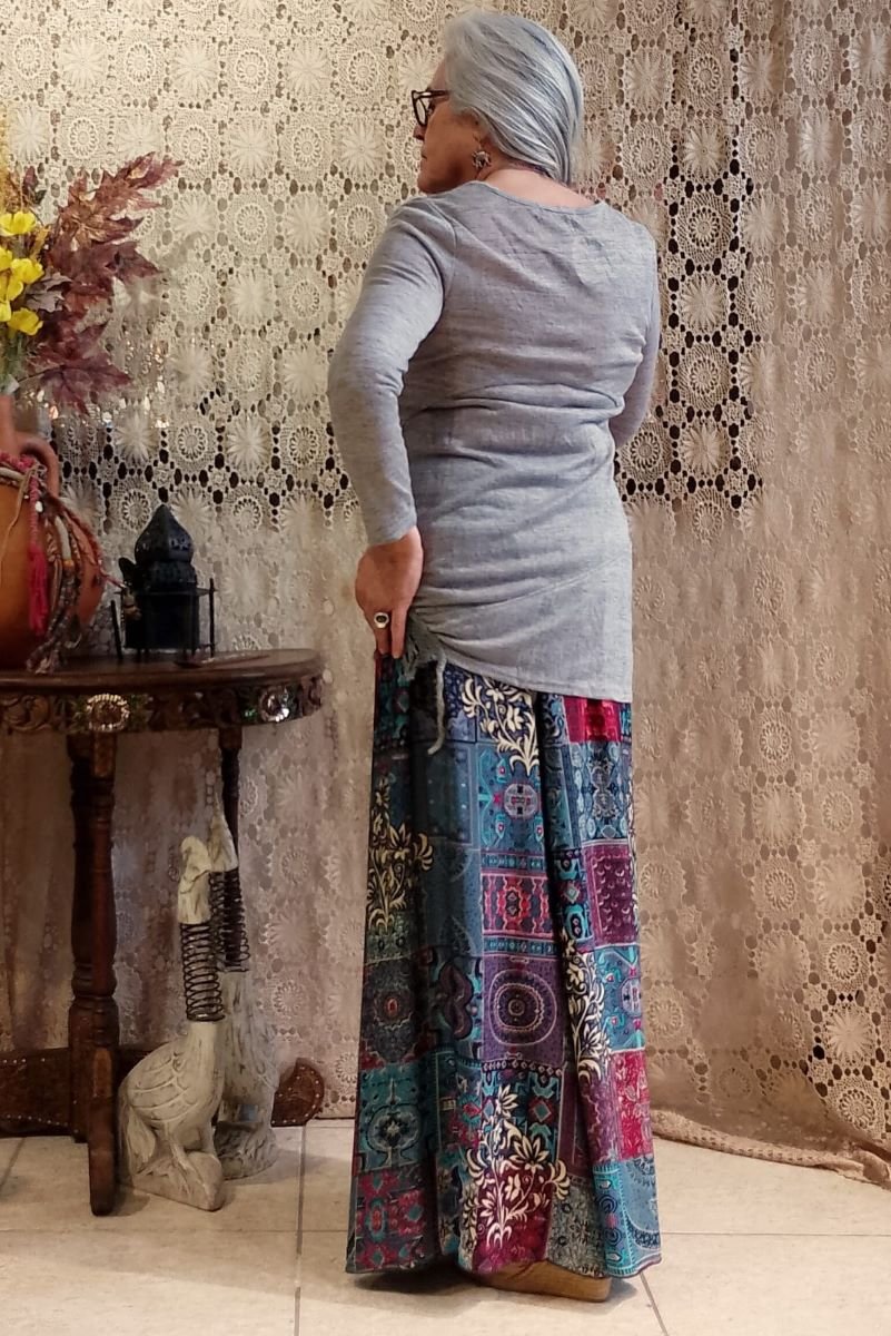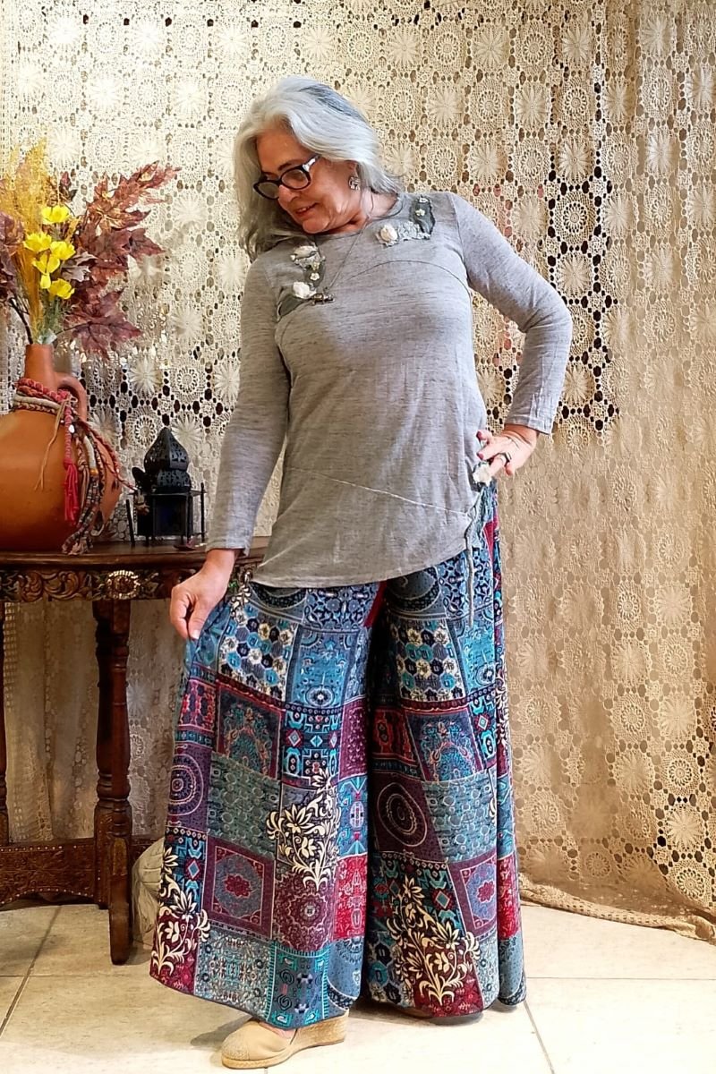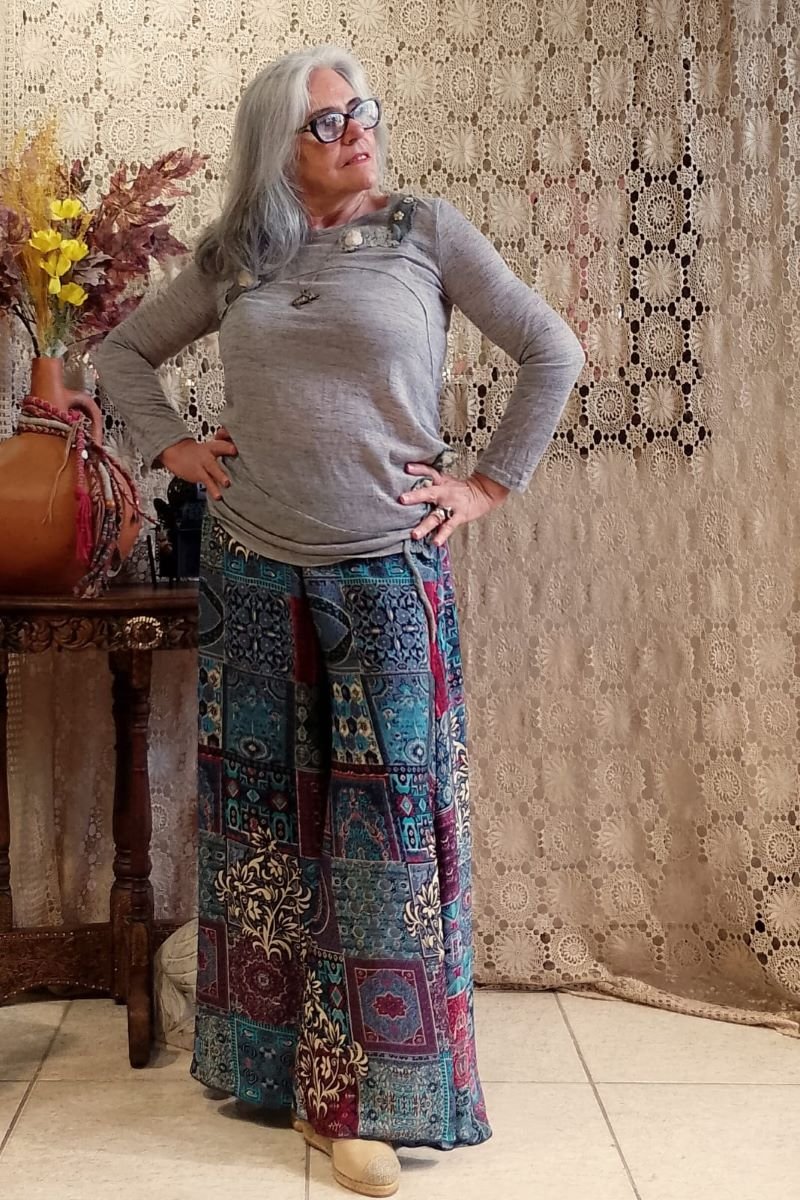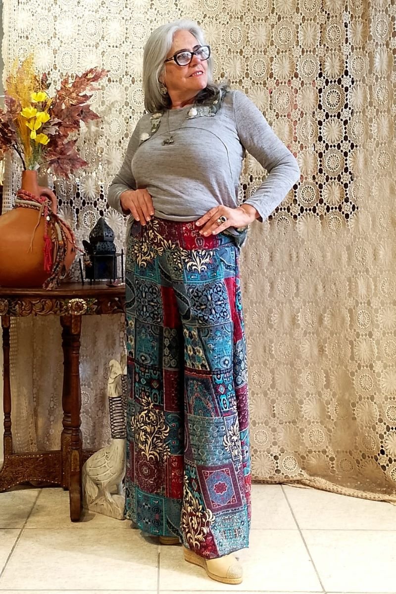 - Sinta a leveza e a sofisticação da nossa Calça Pantalona em Seda Indiana. Com uma estampa digital moderna com fundo cinza e estampa com predominância das cores azul turquesa e vermelho, esta peça une o movimento fluido das pernas amplas ao conforto da cintura alta com pala e lastex. Um design atemporal que valoriza a silhueta, ideal para quem busca elegância e bem-estar do manequim 42 ao 46.