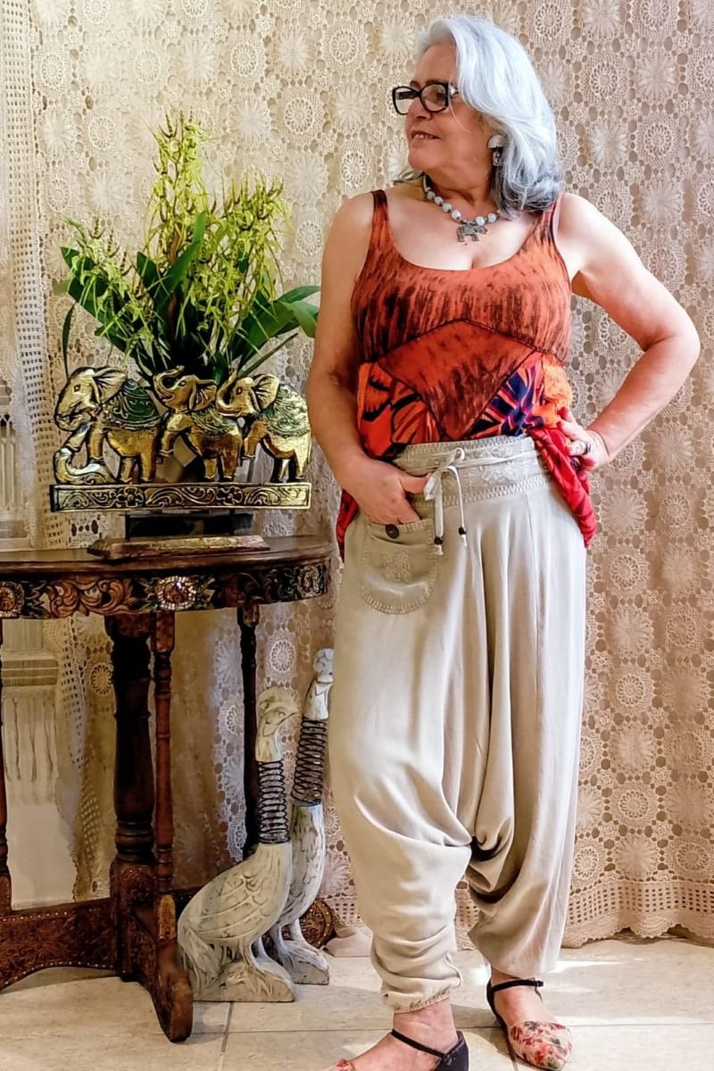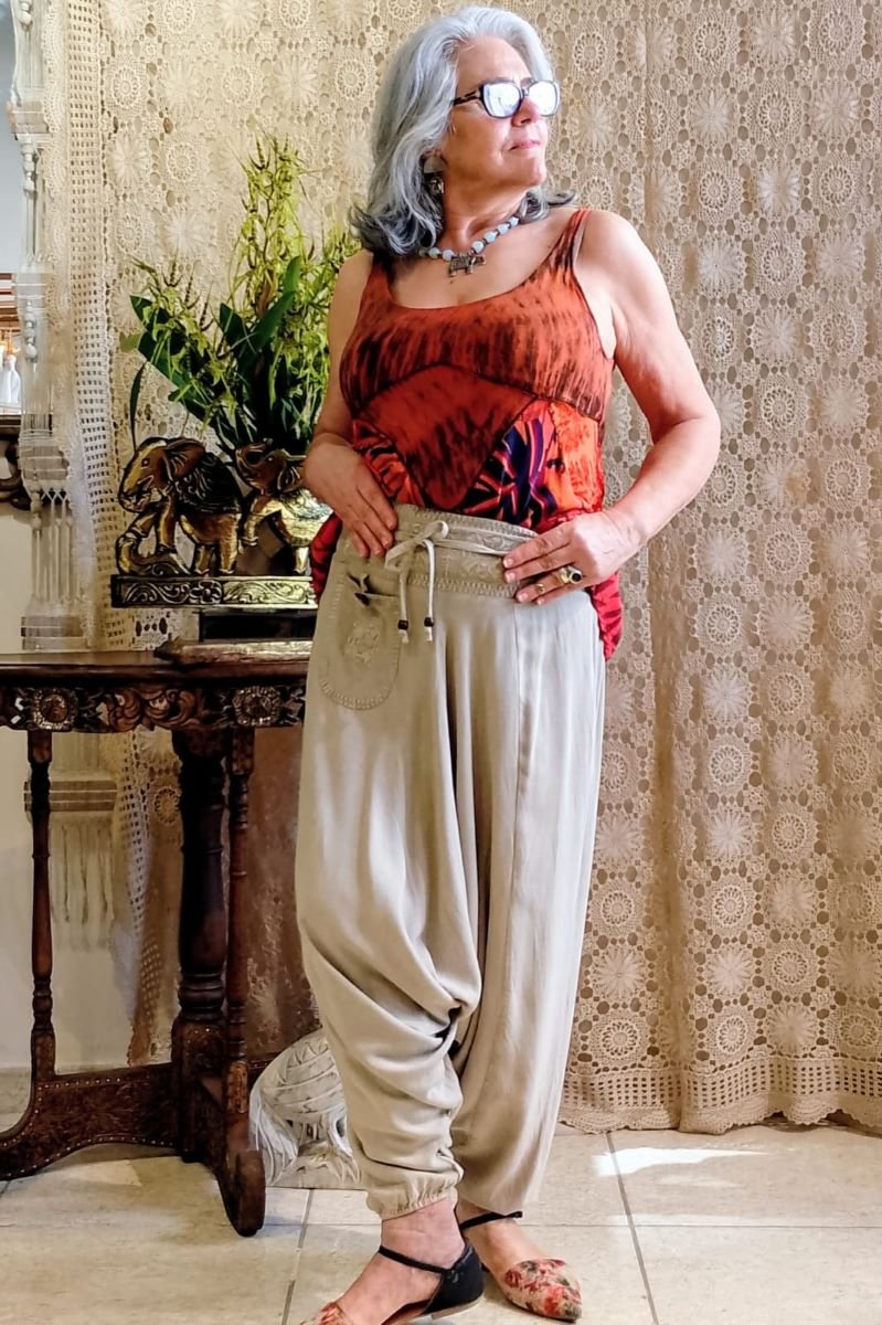 - Calça Saruel em viscose, com lavagem estonada na cor cinza areia. Possui pala bordada, lastex nas costas, bolso lateral e barra com elástico. Conforto e autenticidade em uma peça boho atemporal.
