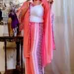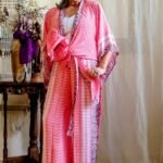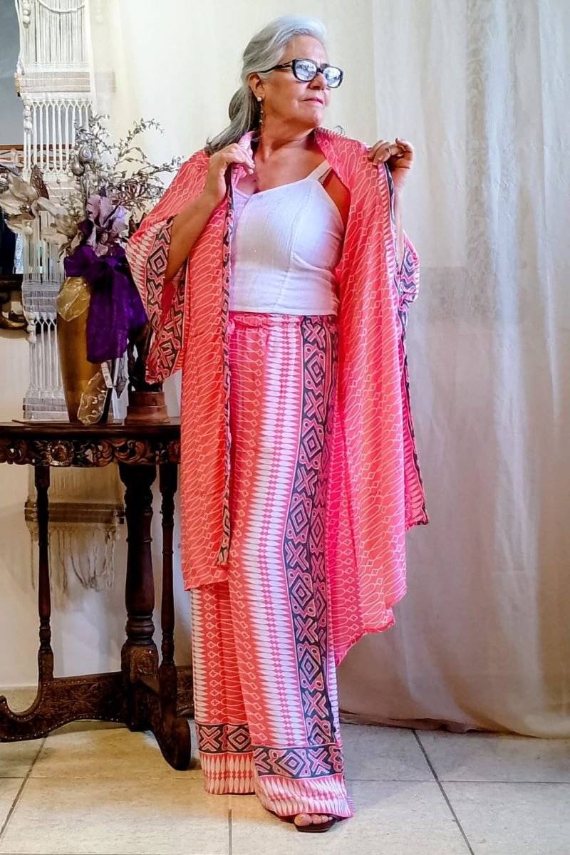 - Kimono longo em seda indiana, estampado, com predominância da cor rosa
