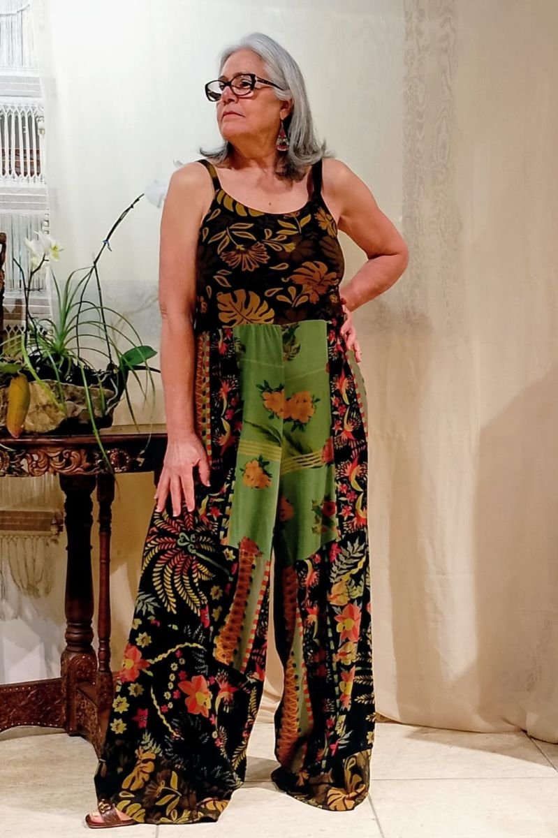 - Macacão Pantalona em viscose estampada estilo patchwork floral, com tons de verde e preto. Com alças e parte superior em elastano, oferece caimento amplo e confortável, vestindo do 42 ao 48.