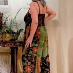 - Macacão Pantalona em viscose leve, com estampa patchwork floral que mistura tons de verde e preto em perfeita harmonia.