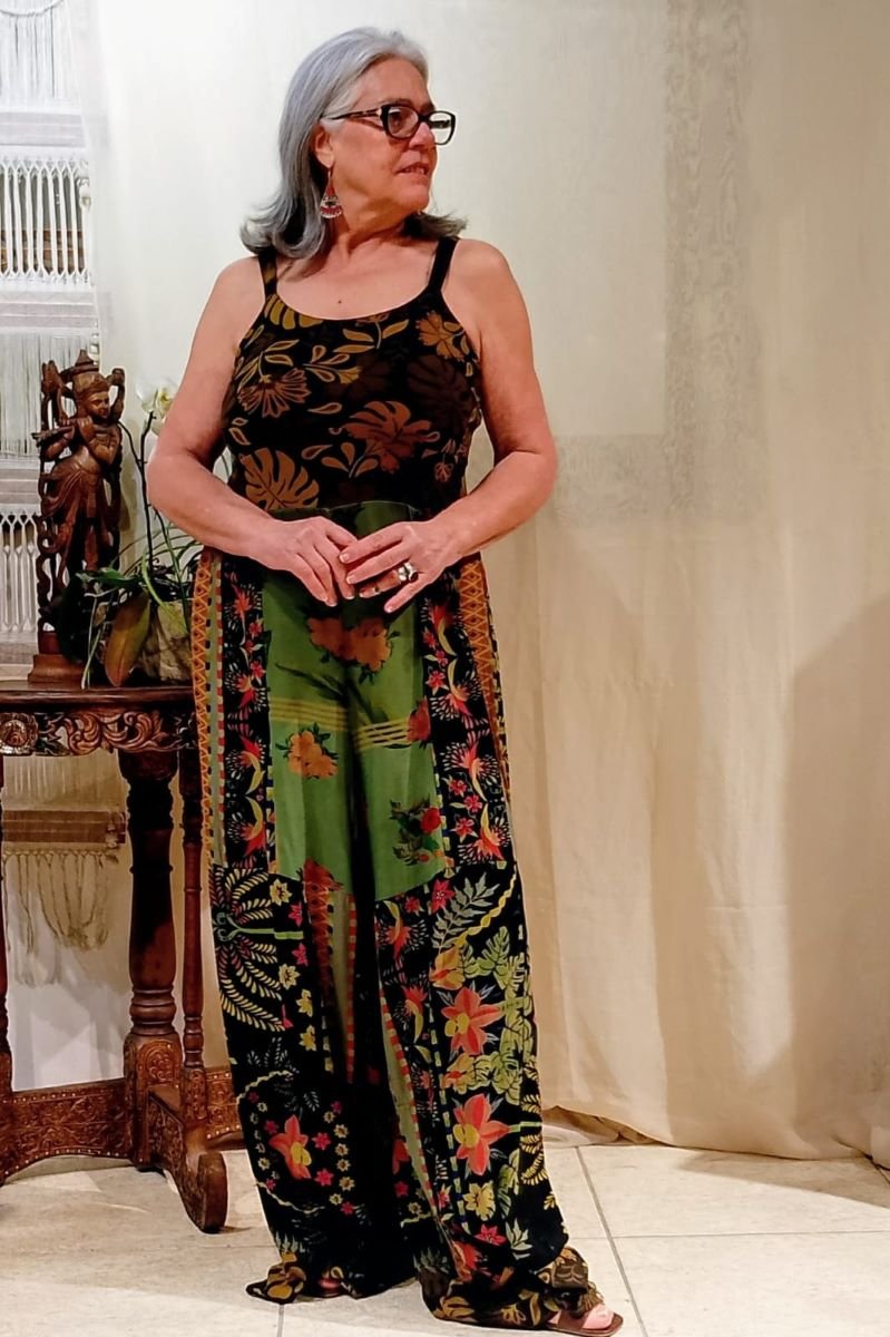 Macacão Pantalona em Viscose Alça PatchworkVerde Musgo e Preto G