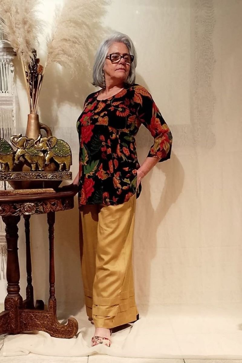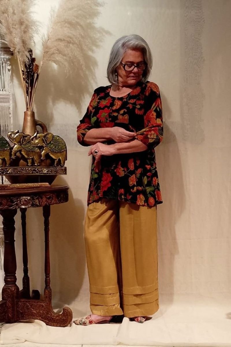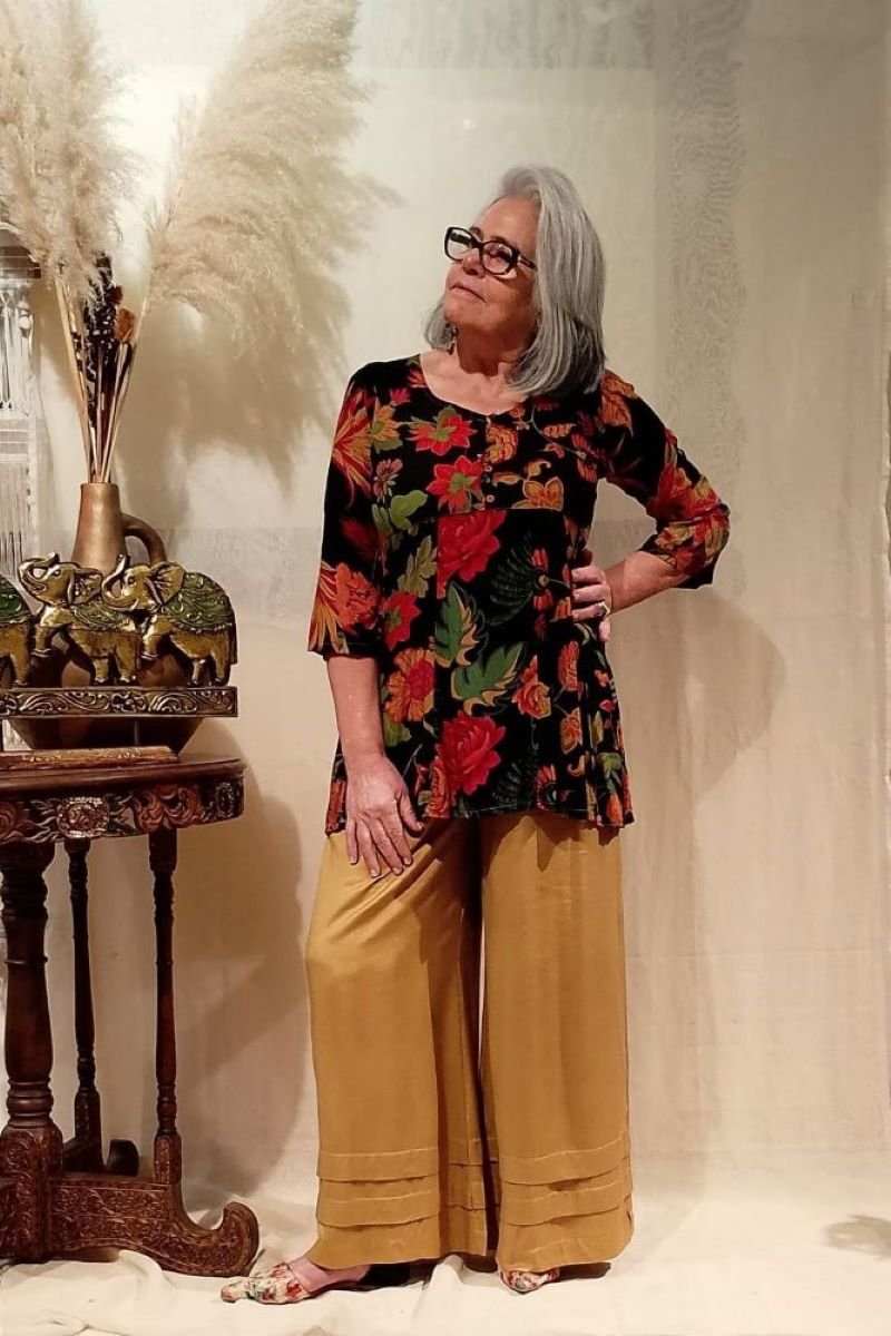 - Túnica em viscose estampada, com meias mangas e com corte evasê