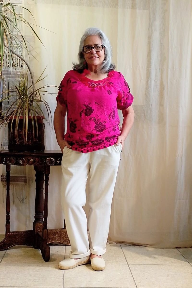 O caimento reto e os passantes nos quadris permitem usar com ou sem cinto, criando diferentes propostas de look.