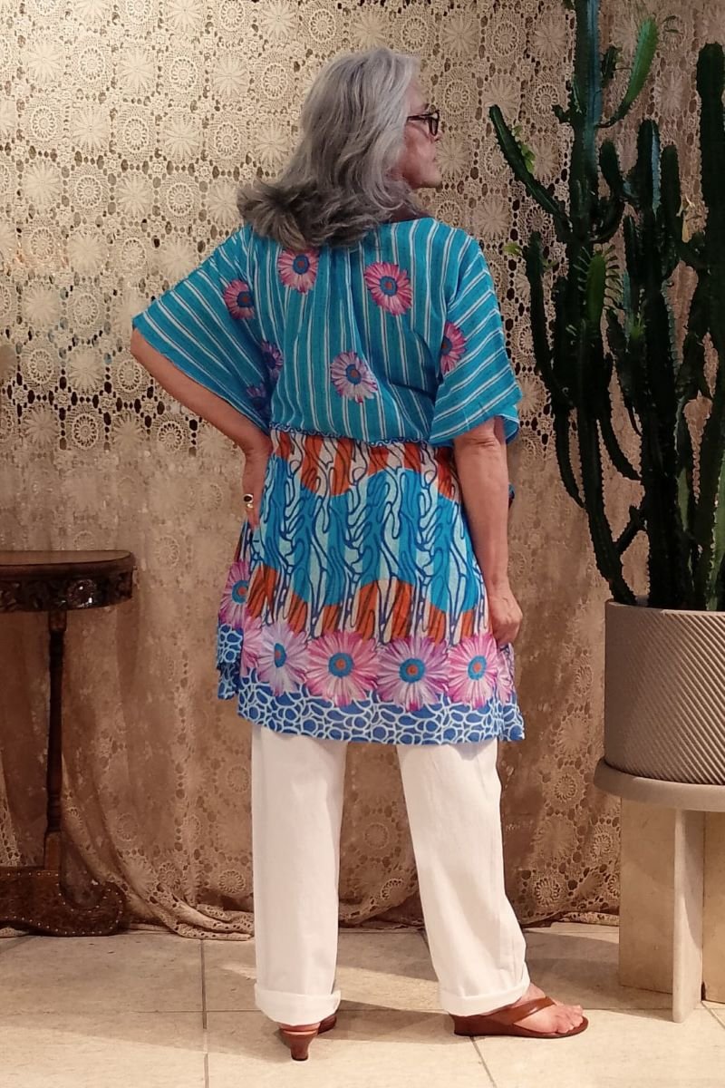 - Sinta a versatilidade com esta peça única em algodão indiano. Com fundo azul e estampa floral, a kaftan destaca-se pelos bordados no decote, onde tem pala marron, contrastando lindamente com o fundo azul. Seu design oversized com ajuste na cintura permite dinamismo total: use como vestido, túnica ou uma elegante saída de praia. Peça de tamanho único que valoriza todos os estilos, vestindo confortavelmente do manequim 40 ao 50.