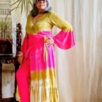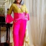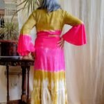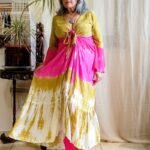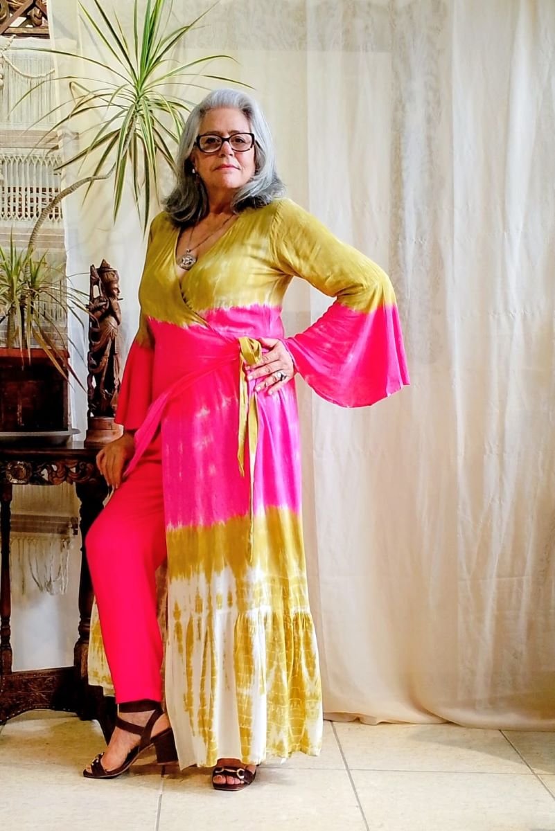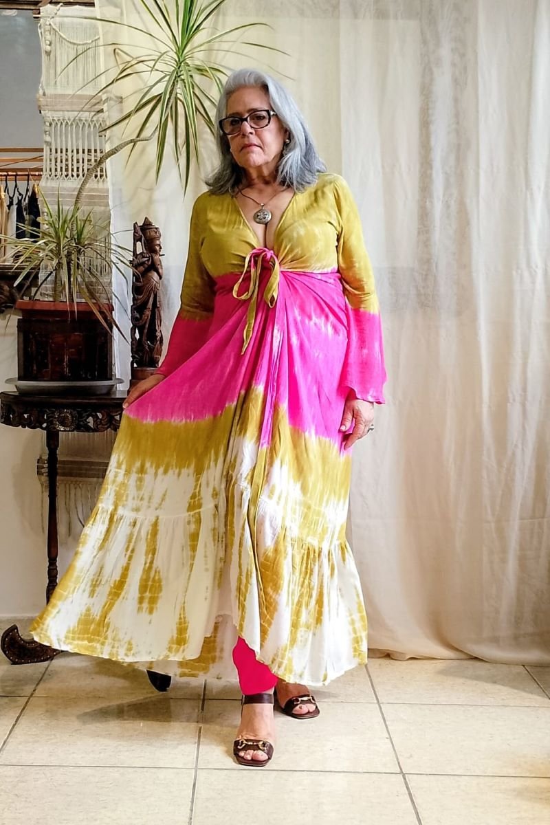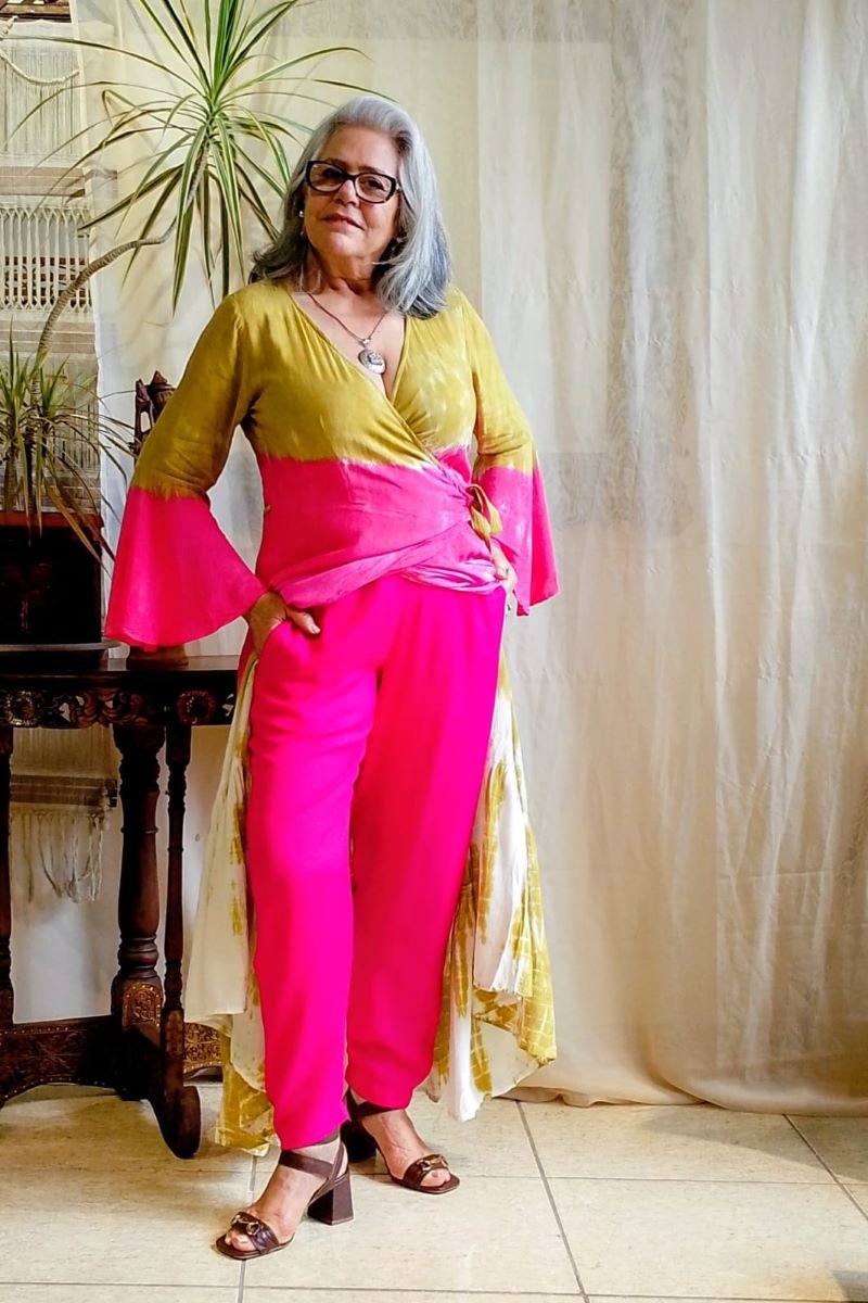 - O tecido leve e o tingimento tie-dye nas cores pink e verde musgo trazem uma energia vibrante e ao mesmo tempo sofisticada