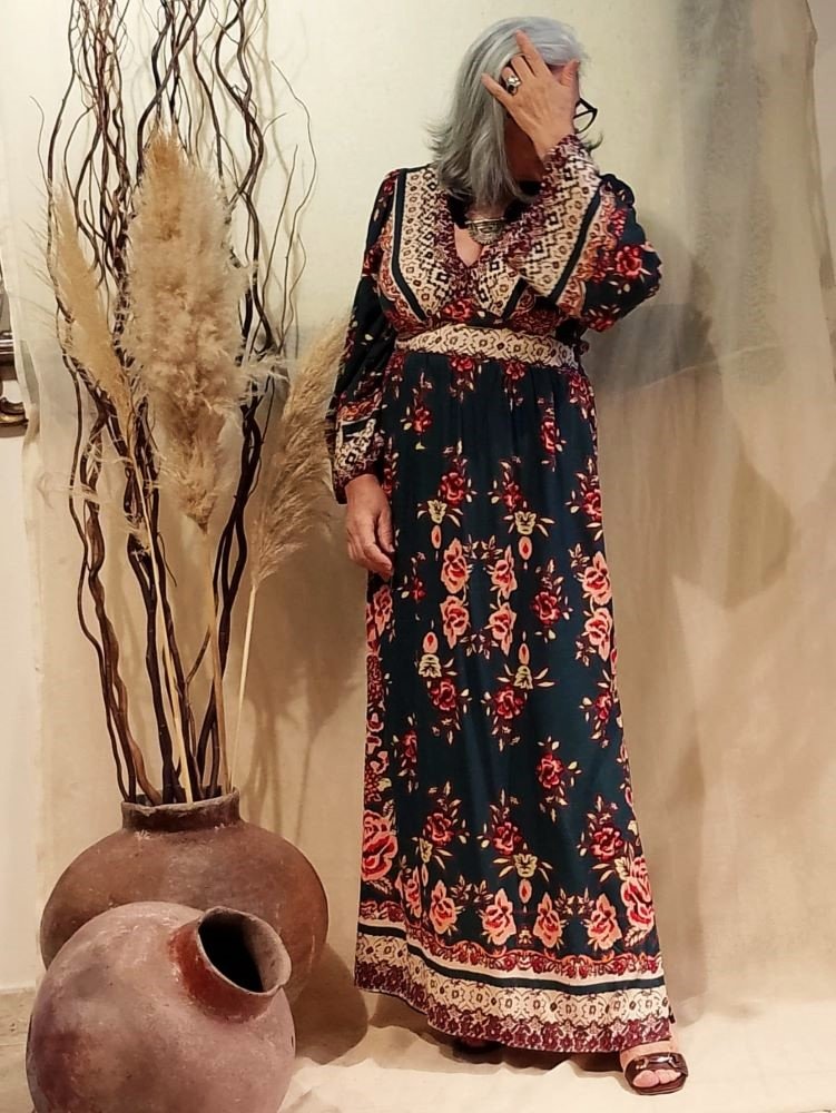 Encante com o charme atemporal do nosso vestido longo em viscose. Com estampa floral delicada, decote em V profundo e mangas amplas com barrado, a peça traz fluidez e sofisticação na medida certa. O detalhe de lastex nas costas garante conforto e caimento impecável. Fendas laterais e acabamento especial criam um visual boho elegante e cheio de personalidade.