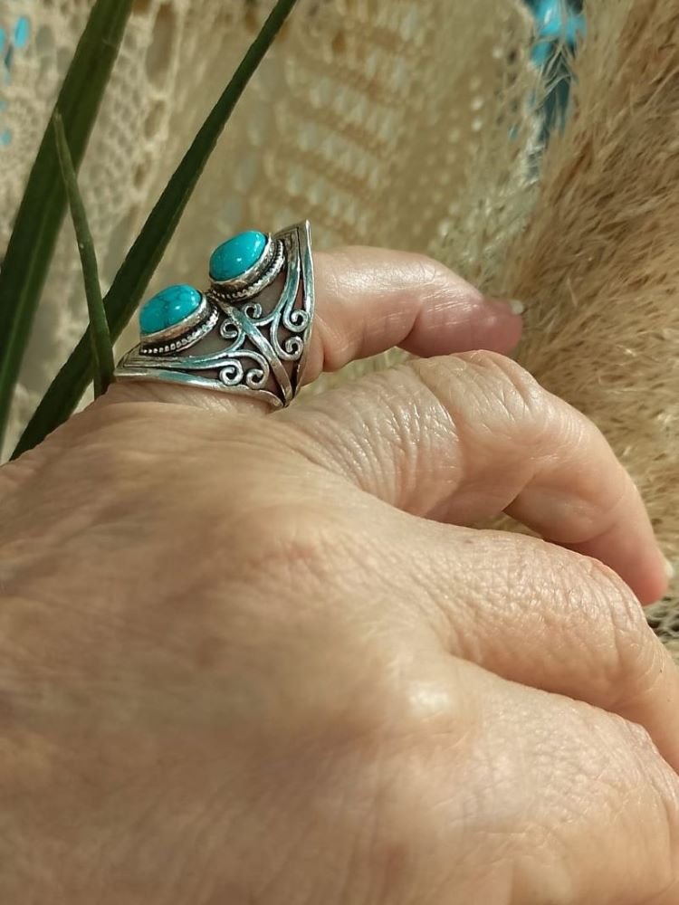 Anel Prateado Anatômico com 2 Pedras Gota Turquesa